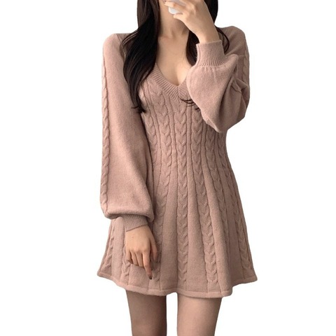 South Korean Vintage Pattern A-Line Knitted Sweater Dress for Women Chic Autumn Winter Collection Open Puff Sleeves Long