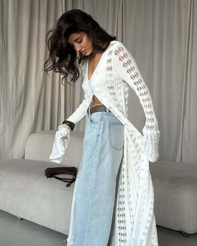Women's Casual White 2025 Knitted Cardigan Coat with Front Logo and Flower Decoration for Spring